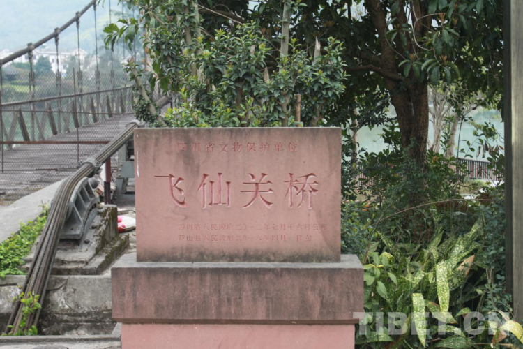 站在橋邊,遙望蜿蜒的江水就是青衣江,飛仙關(guān)橋全長164米,寬4.5米,索塔為鋼筋混凝土門式框架,高29米,流動式索鞍,策略式索錠,當時的設(shè)計載重為15噸。橋柱橫額上有時任西南軍政委員會主席劉伯承所題寫的橋名——“飛仙關(guān)橋”。橋西岸塔柱有時任十八軍政委譚冠三題寫的檻聯(lián)——“發(fā)揮天才,發(fā)揮力量,戰(zhàn)勝困難,創(chuàng)造人民幸福,一面進軍,一面建設(shè)解放西藏,鞏固西南國防”的字樣。東岸塔柱上有時任西康省主席廖志高題寫的檻聯(lián)——“勞動創(chuàng)造世界飛仙天險何難克服,革命帶來幸福閉塞邊區(qū)從此繁榮”字樣。橋上五顆閃閃的紅星,映照著飛仙關(guān)的繁榮,也印證著革命前輩們的美好愿景已經(jīng)變?yōu)楝F(xiàn)實。