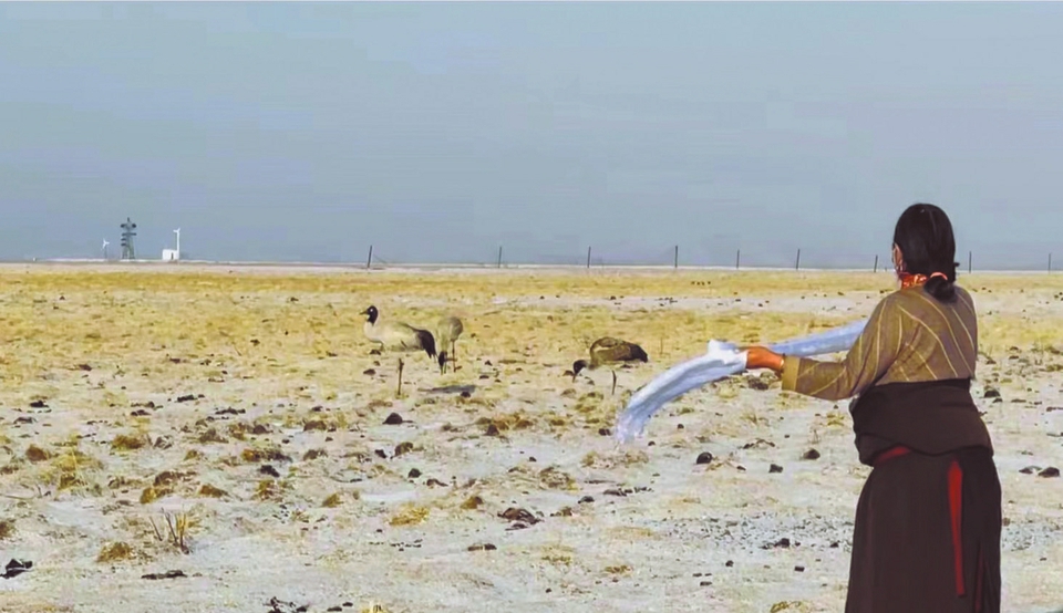 如科分享的視頻顯示,3月13日,雪后的若爾蓋銀裝素裹,獵獵的風(fēng)吹動著如科房上的旗幟,四只黑頸鶴在黃色的草堆旁游走覓食。由他們精心照料的黑頸鶴夫婦,攜帶著兩只逐漸長大的小鶴,成為今年首批回到若爾蓋濕地的種群。按照往年的慣例,如科的妻子為遠(yuǎn)道而來的“親人”送上哈達(如圖),歡迎它們回歸花湖。