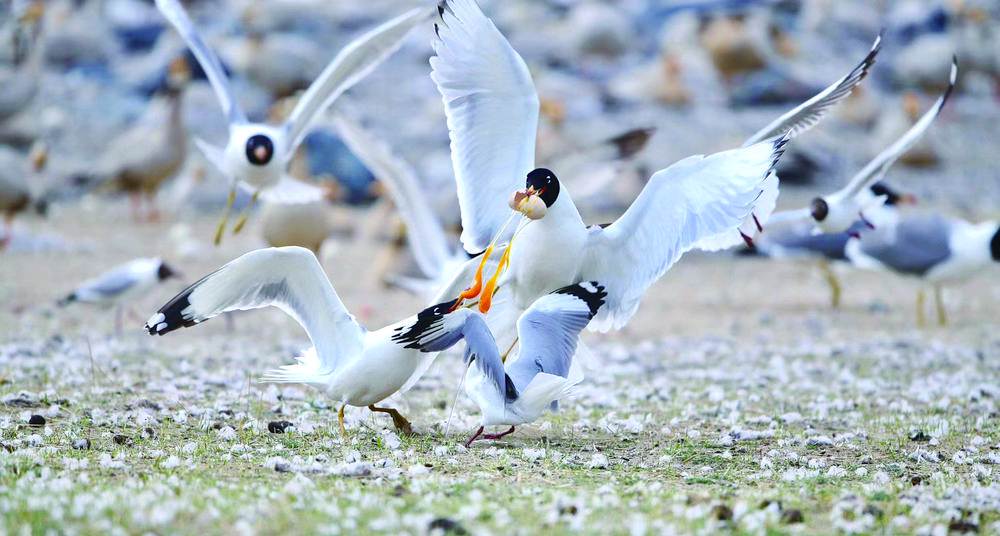 候鳥北歸,青海湖又將進(jìn)入一年中最美麗的時(shí)節(jié)。浮想盛夏時(shí)節(jié),棕頭鷗、漁鷗、斑頭雁、普通鸕鶿等水鳥,或成群在低空中擺著“隊(duì)形”,或“拖家?guī)Э凇痹谒嫔湘覒蛲嫠?,或和洄游的湟魚上演魚鷗“大戰(zhàn)”,碧波蕩漾的青海湖將美得如詩(shī)如畫。(本版圖片除署名外,其他均由青海湖景區(qū)保護(hù)利用管理局提供)