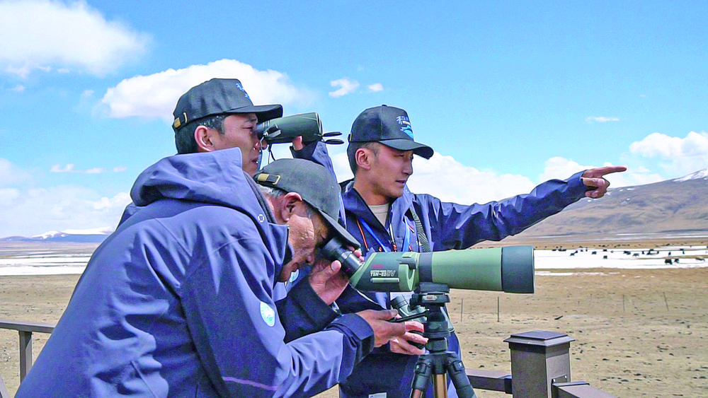 巴桑才仁和兩名濕地生態(tài)管護員調(diào)整著單筒望遠鏡的角度,找尋著“鳥中大熊貓”黑頸鶴的身影。很快,他們就輕松“鎖定”。