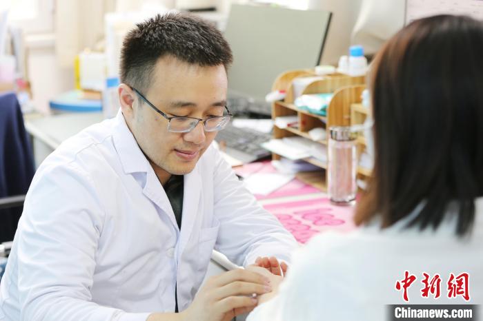 圖為5月17日拍攝的上海援青醫(yī)療人才、青海省中醫(yī)院院長林勛(左)在“名醫(yī)工作室”問診。張?zhí)砀?攝