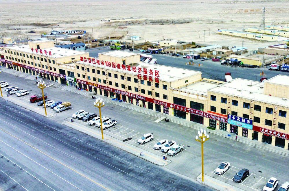 從都蘭縣城出發(fā),沿著109國道向西行駛100多公里,到達巴隆鄉(xiāng)109國道物流經(jīng)濟服務(wù)區(qū)。整個服務(wù)區(qū)干凈整潔,道路一側(cè)是一排黃色三層小樓,各類商鋪云集,樓前的空地上停放著不少車輛。