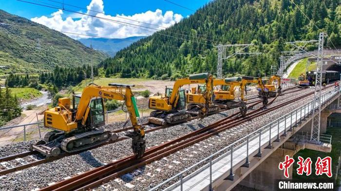 川青鐵路鎮(zhèn)黃段500米長(zhǎng)軌鋪設(shè)采用“直鋪法”和“換鋪法”相結(jié)合的方式組織施工,無(wú)砟道床采取“直鋪法”施工,有砟道床采取“換鋪法”施工,利用工具軌鋪通右線,作為工程路料運(yùn)輸主線,同時(shí)兼顧左線鋪軌、長(zhǎng)軌焊接鎖定及大機(jī)搗固穿插施工作業(yè)?!盀榇_保鋪軌安全有序推進(jìn),專門(mén)配置了HXN5型高原大功率內(nèi)燃機(jī)車等80余臺(tái)(輛)大型設(shè)備開(kāi)展軌道施工作業(yè)?!睆埲A稱,期間項(xiàng)目部合理分配資源,5天完成100公里長(zhǎng)鋼軌鋪設(shè),12天完成100公里無(wú)縫線路單元焊接及放散鎖定工作。