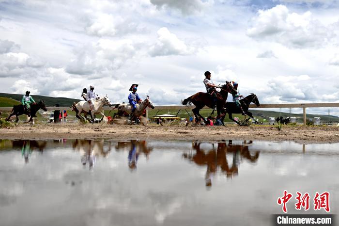 7月30日,四川理塘,參賽選手們快速從賽場一處水塘邊通過。中新社記者 劉忠俊 攝