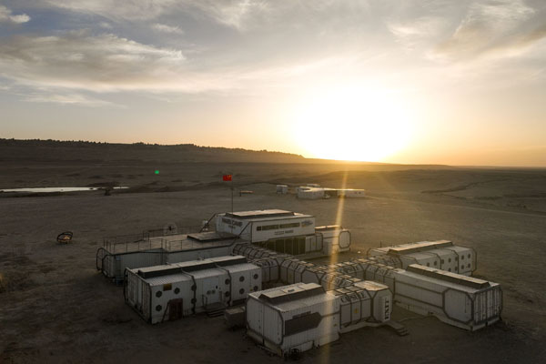汽車沿“火星一號”公路顛簸前行近百公里,一片由白色集裝箱拼裝而成的營地出現(xiàn)在眼前。這是一個集科學(xué)探索、旅游觀光、戶外探險于一體的綜合性營地,走進夢幻般的甬道,太空艙像蜂巢一般立在眼前,仿佛置身于另一個世界。