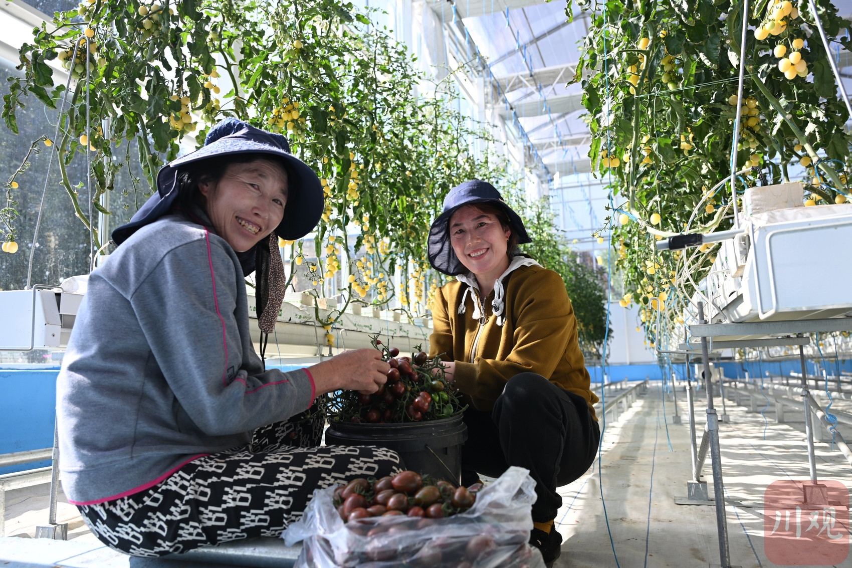 當(dāng)?shù)剞r(nóng)民正在智慧農(nóng)業(yè)無土栽培館內(nèi)摘取成熟的作物。