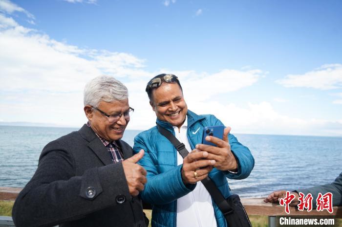 圖為尼泊爾媒體考察團(tuán)成員點(diǎn)贊青海湖。中新社記者 馬銘言 攝