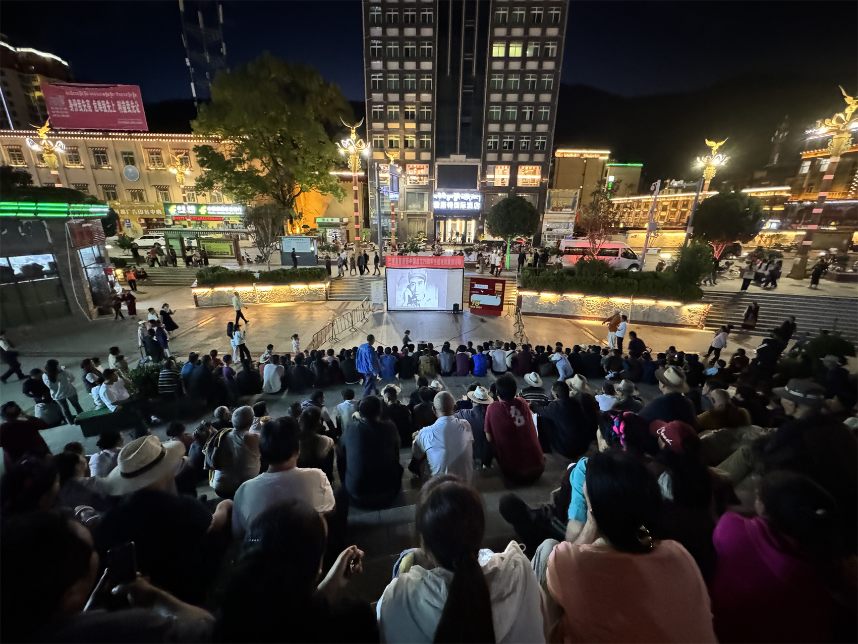 “吃過晚飯就來廣場等著了,好久沒看過壩壩電影,今天帶著小孩來感受一下?!卑吞量h市民翁吉說。夜幕降臨,巴塘縣中山廣場早早地聚集了眾多滿懷期待的市民。一塊巨大的白色幕布在廣場中央拉起,仿佛在訴說著一個個精彩的故事。工作人員們忙碌地調(diào)試著設(shè)備,為即將開始的電影放映做著最后的準(zhǔn)備。