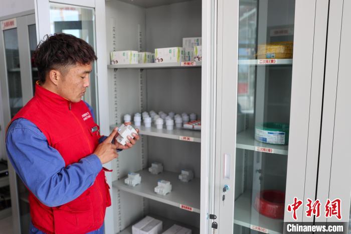 10月17日,在青海省海北藏族自治州剛察縣果洛藏貢麻村,久邁多杰檢查庫(kù)房?jī)?nèi)的備品備件。中新社記者 薛蒂 攝