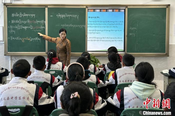 近日,色達(dá)縣中學(xué)東校區(qū),學(xué)生們?cè)谏喜匚恼n。中新社記者 王鵬 攝