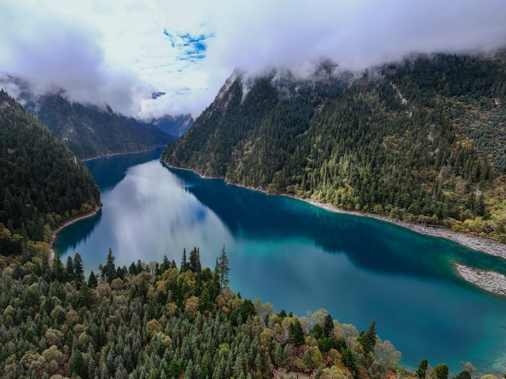 從高空中俯瞰,樹正溝、日則溝和則查洼溝3條主溝呈不規(guī)則的“Y”字形躺臥于九寨溝起伏的峰巒之間。數(shù)以萬計的游客散落在綿延40多公里的狹長溝谷內,卻并不顯得擁擠。