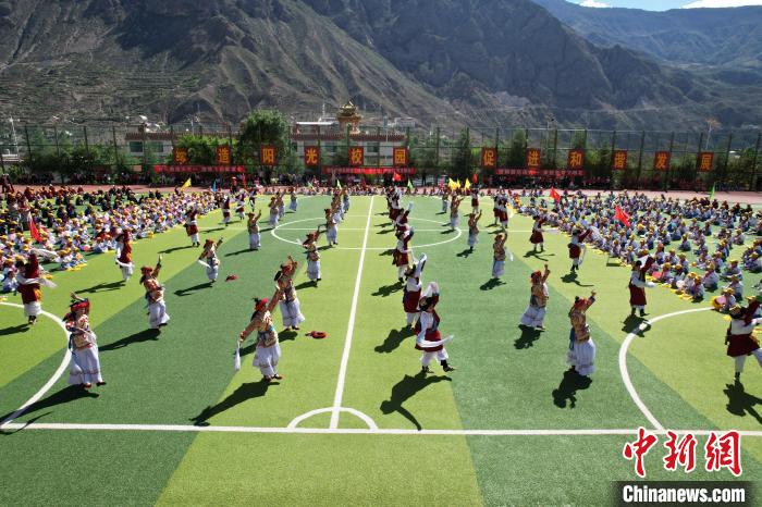 10月14日,德欽縣第二小學(xué)學(xué)生在足球場(chǎng)上跳集體鍋莊舞。 (德欽縣第二小學(xué)供圖)
