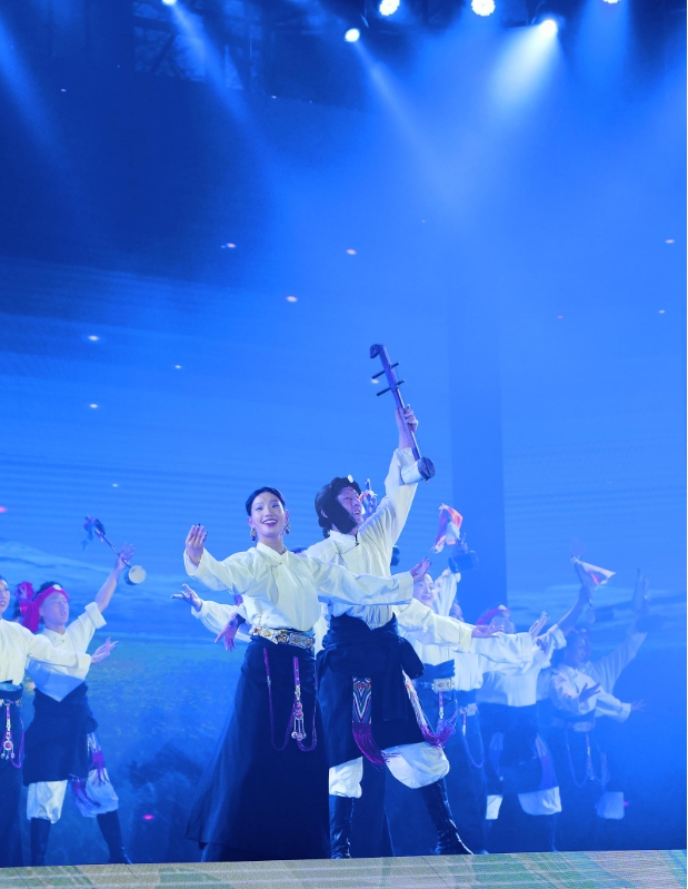 玉樹擁有豐富多樣的非物質(zhì)文化遺產(chǎn),于2017年設(shè)立了國家級藏族文化(玉樹)生態(tài)保護(hù)實驗區(qū),這一舉措不僅強(qiáng)化了對藏族文化的保護(hù),也促進(jìn)了當(dāng)?shù)匚幕膫鞒信c發(fā)展。此次展演由開篇、第一章生命之源、第二章文化之魂、第三章五彩的三江源、尾聲五個部分組成,玉樹州民族歌舞團(tuán)精心挑選了玉樹伊舞、熱巴舞、藏族民歌等具有玉樹代表性的13個節(jié)目進(jìn)行了展示。
