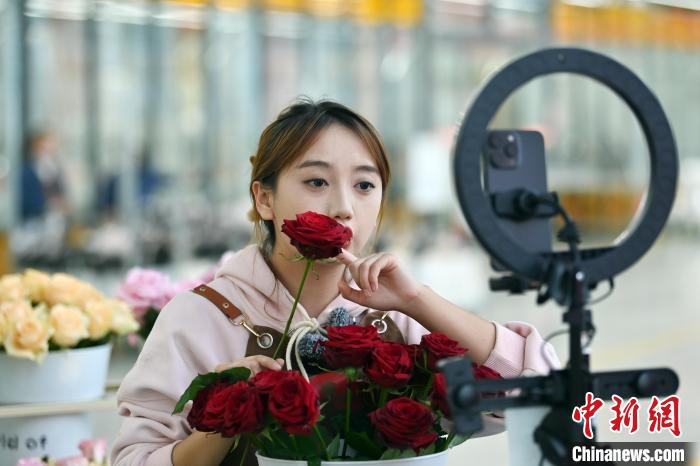 11月20日,在甘肅省臨夏回族自治州臨夏市百益億農(nóng)國際鮮花港內(nèi),工作人員進行網(wǎng)絡(luò)直播售賣鮮切玫瑰。九美旦增 攝