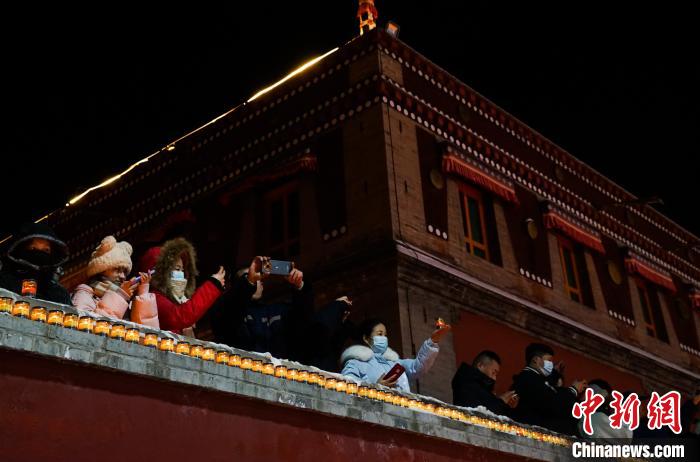 天黑后,寺院內(nèi)法號(hào)低回,路兩旁、院墻上、殿堂外,均燃起酥油燈盞。不遠(yuǎn)處煨桑爐煙火繚繞,與人們呼出的氤氳白氣一起消散在空中。