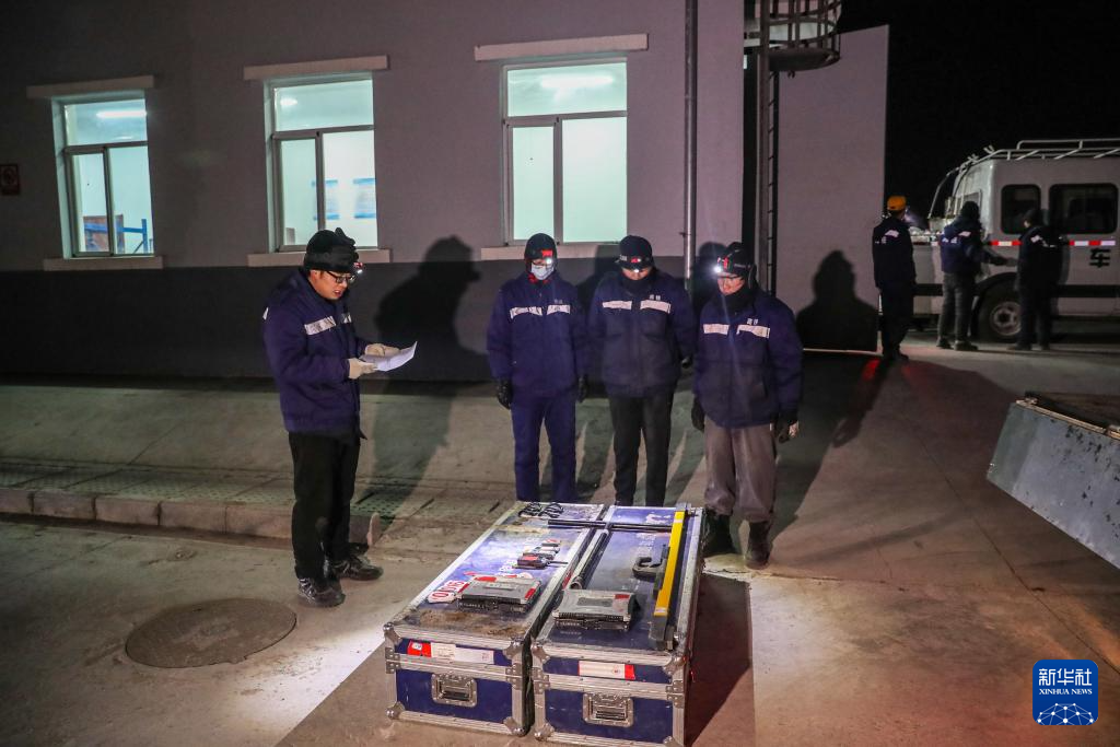 1月14日凌晨,在新烏鞘嶺隧道通道門外,橋隧工在上道前清點工具材料。新華社記者 郎兵兵 攝