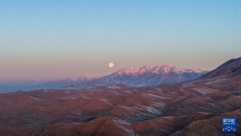 這是1月14日在新烏鞘嶺隧道附近拍攝的山脈與月亮(無人機照片)。新華社記者 郎兵兵 攝