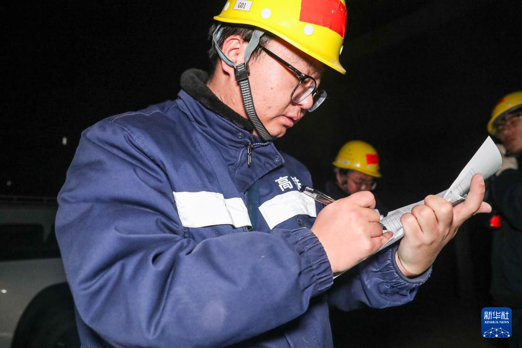 1月13日晚,在新烏鞘嶺隧道通道門外,“95后”橋隧工工長金炻正在清點工具材料。新華社記者 郎兵兵 攝