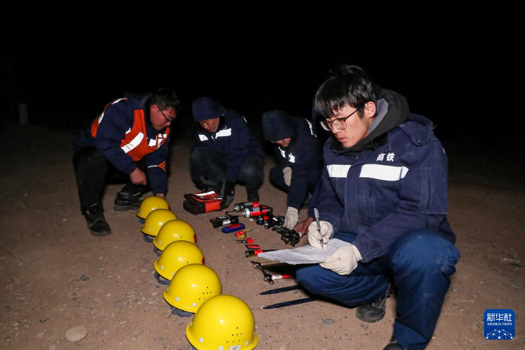 1月13日晚,在天祝西高鐵綜合維修基地,線路工正在清點工具材料。新華社記者 郎兵兵 攝