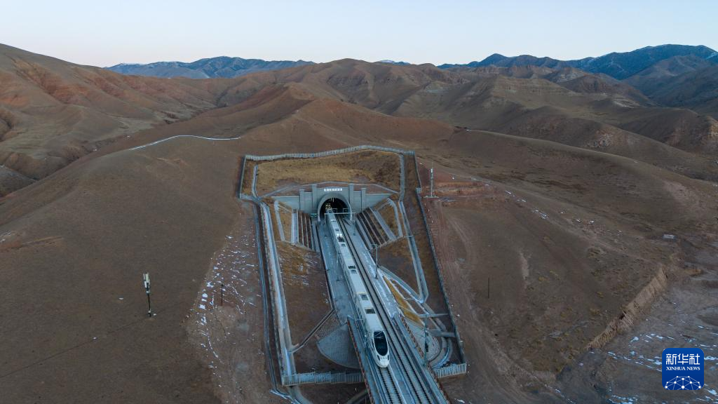 1月14日8時20分許,蘭州西發(fā)往武威東的D8885次動車組列車穿過新烏鞘嶺隧道(無人機照片)。新華社記者 郎兵兵 攝