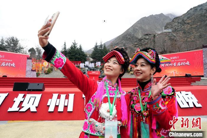 1月25日,四川理縣,當(dāng)?shù)孛癖娭褡宸椩诖逋憩F(xiàn)場(chǎng)合影留念。中新社記者 安源 攝