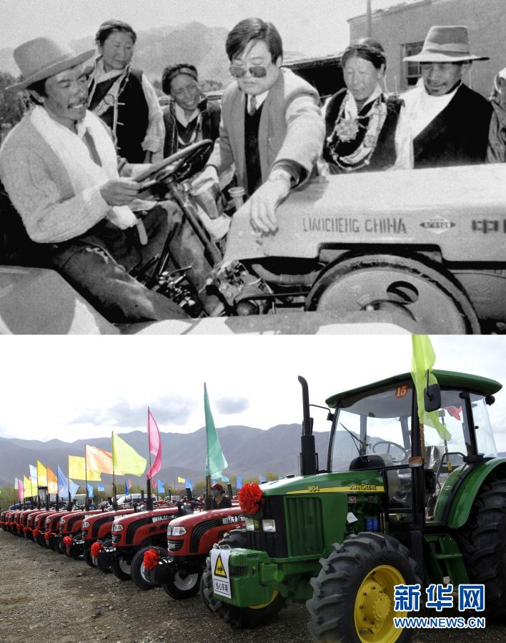 拼版照片:上圖是1996年,山東省援助西藏的首批農(nóng)機(jī)物資日前抵達(dá)日喀則。圖為山東援藏干部在給當(dāng)?shù)夭刈遛r(nóng)民講解農(nóng)機(jī)具的使用方法(新華社記者 土登 攝);下圖是2012年5月4日,西藏日喀則市白朗縣成為西藏自治區(qū)第一個農(nóng)業(yè)機(jī)械化示范縣。圖為停放在白朗縣田間的農(nóng)業(yè)機(jī)械(新華社記者 多吉占堆 攝)。新華社發(fā)
