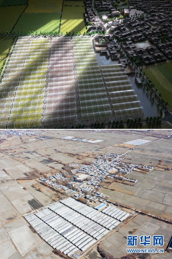 拼版照片:上圖是西藏山南市乃東區(qū)克松村社區(qū)農(nóng)業(yè)產(chǎn)業(yè)生產(chǎn)基地規(guī)劃圖(2月9日攝);下圖是克松村社區(qū)農(nóng)業(yè)產(chǎn)業(yè)生產(chǎn)基地(2月9日攝,無人機(jī)照片)。新華社記者 普布扎西 攝