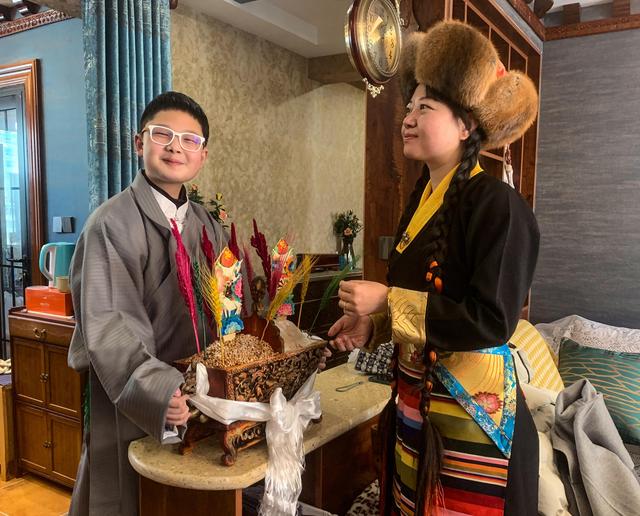 2月12日,在西藏拉薩,達(dá)娃的漢族媳婦丁女士(右)吃切瑪,過新年。新華社發(fā)(達(dá)娃 攝)