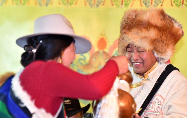 2月12日,拉薩市當(dāng)雄縣牧民互相敬獻(xiàn)青稞酒。新華社記者 覺果 攝