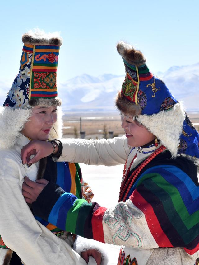 2月12日拍攝的著盛裝的拉薩市當(dāng)雄縣藏族牧民。新華社記者 覺果 攝