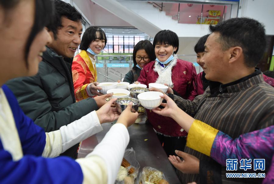 2月12日,合肥市第三十五中學西藏班的老師和學生們一起喝藏式甜茶慶祝藏歷新年和農(nóng)歷春節(jié)。新華社記者 周牧 攝