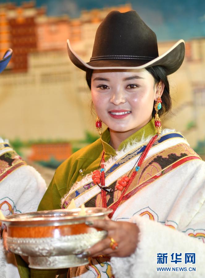2月12日,在藏北當(dāng)雄縣沖噶村,一名牧民盛裝敬酒。新華社記者 覺(jué)果 攝