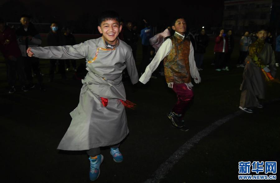 武漢西藏中學(xué)學(xué)生在操場(chǎng)上表演節(jié)目(2月12日攝)。新華社記者 程敏 攝