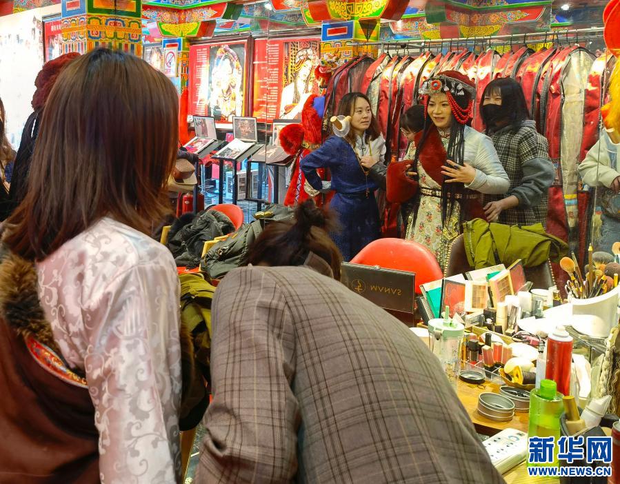 圖為換上藏裝準備拍攝寫真的游客(2021年3月20日攝)。新華社記者李鍵 攝