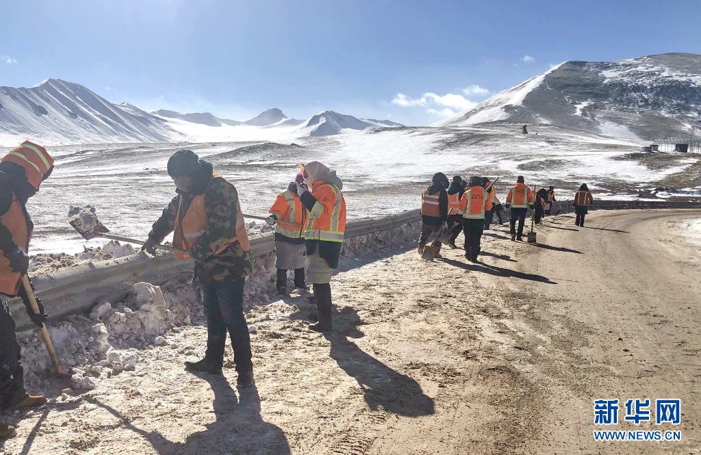 在國道109線K3351路段,安多公路養(yǎng)護(hù)段工作人員進(jìn)行除雪除冰作業(yè)(2020年3月11日攝)。新華社發(fā)(后耀軍 攝)