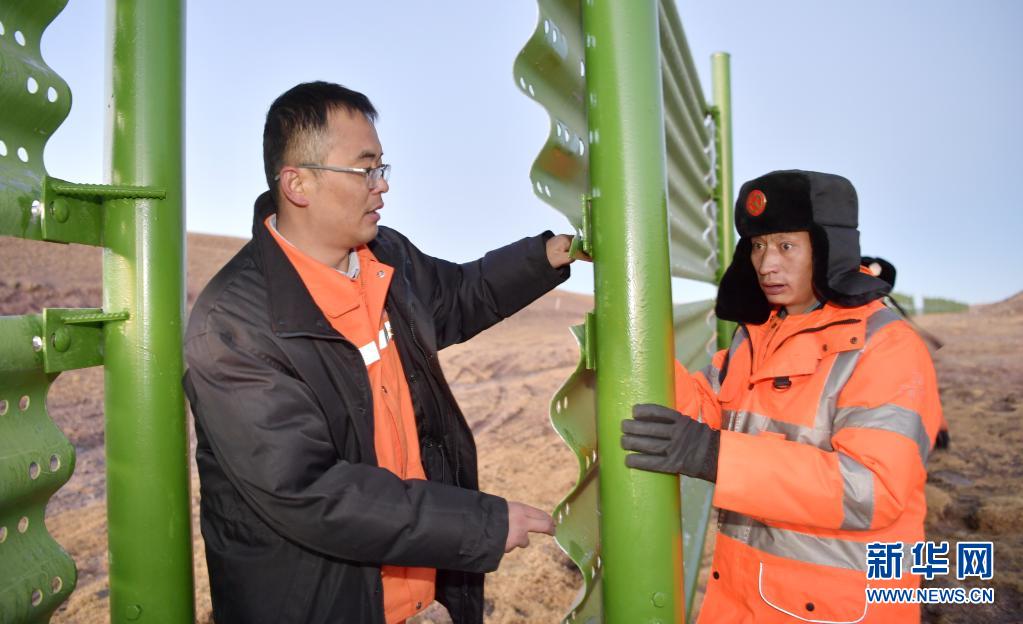 在國道109唐古拉山口處,安多公路養(yǎng)護(hù)段工作人員檢查山口的擋雪板(1月13日攝)。新華社記者 張汝鋒 攝