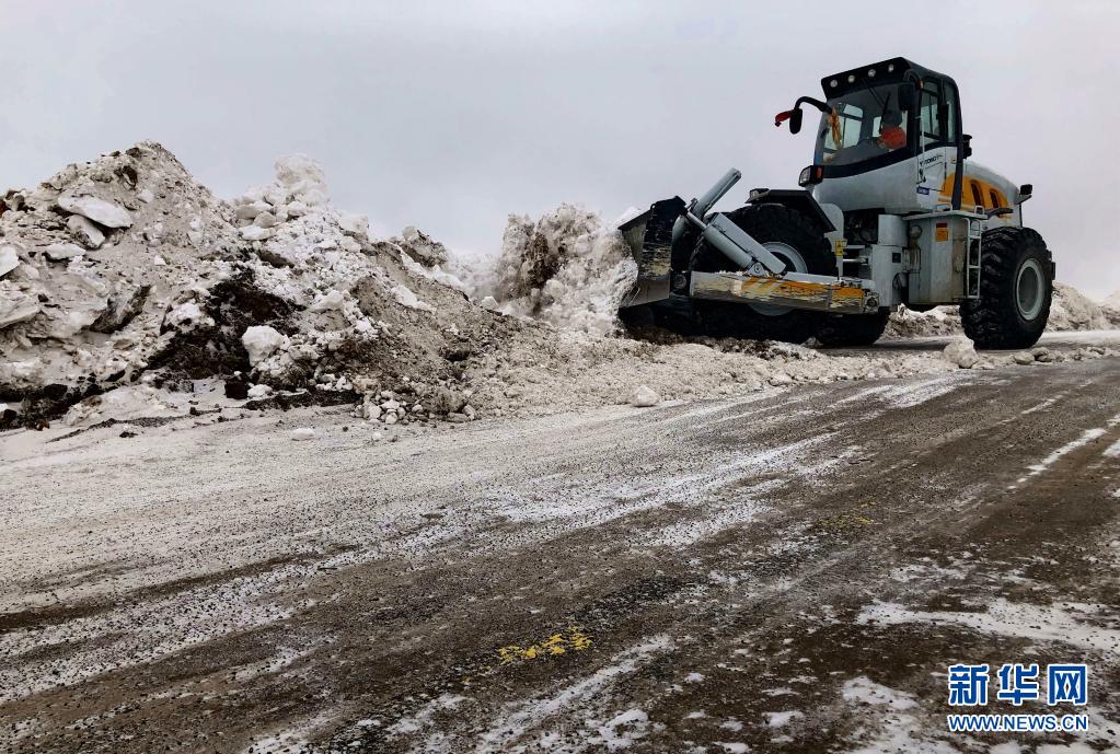 在國道109線K3378路段,安多公路養(yǎng)護(hù)段投入大型機(jī)械清除冰雪(2019年2月16日攝)。新華社發(fā)(邊巴央吉 攝)