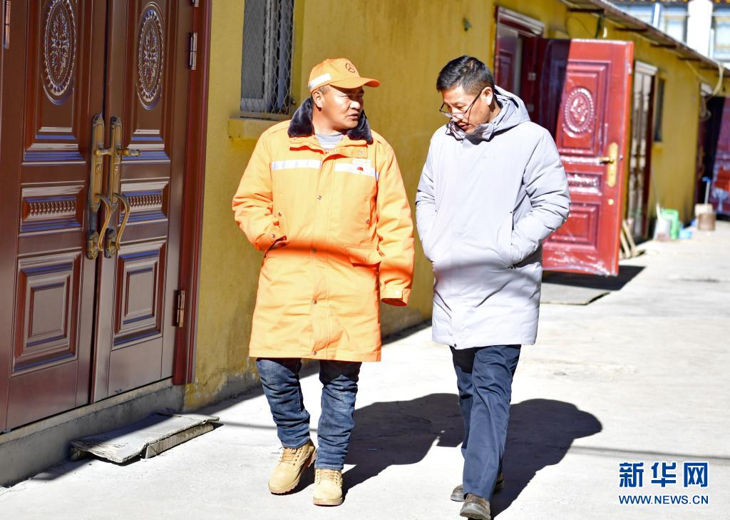 在安多公路養(yǎng)護(hù)段家屬院,扎西次仁(左)和來訪的客人交流(1月13日攝)。新華社記者 張汝鋒 攝