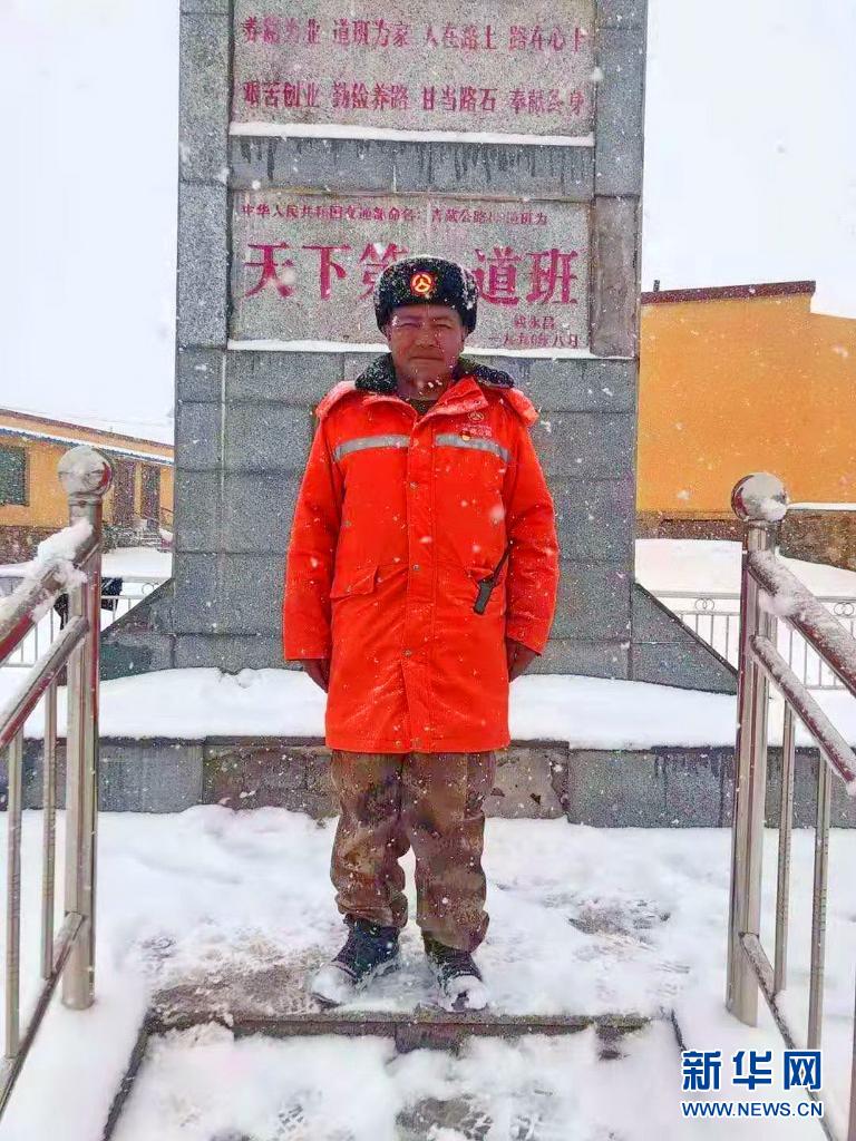 扎西次仁在“天下第一道班”紀(jì)念碑前留影(2020年5月3日攝)。新華社發(fā)