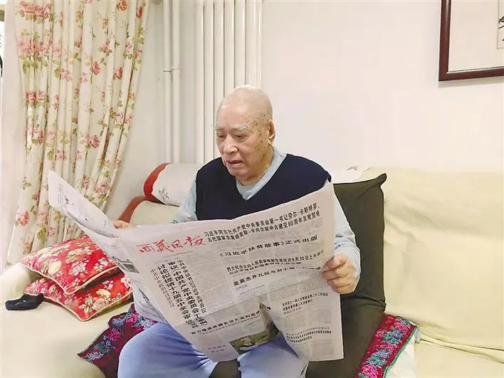 圖為開(kāi)斗山在北京家中閱讀《西藏日?qǐng)?bào)》