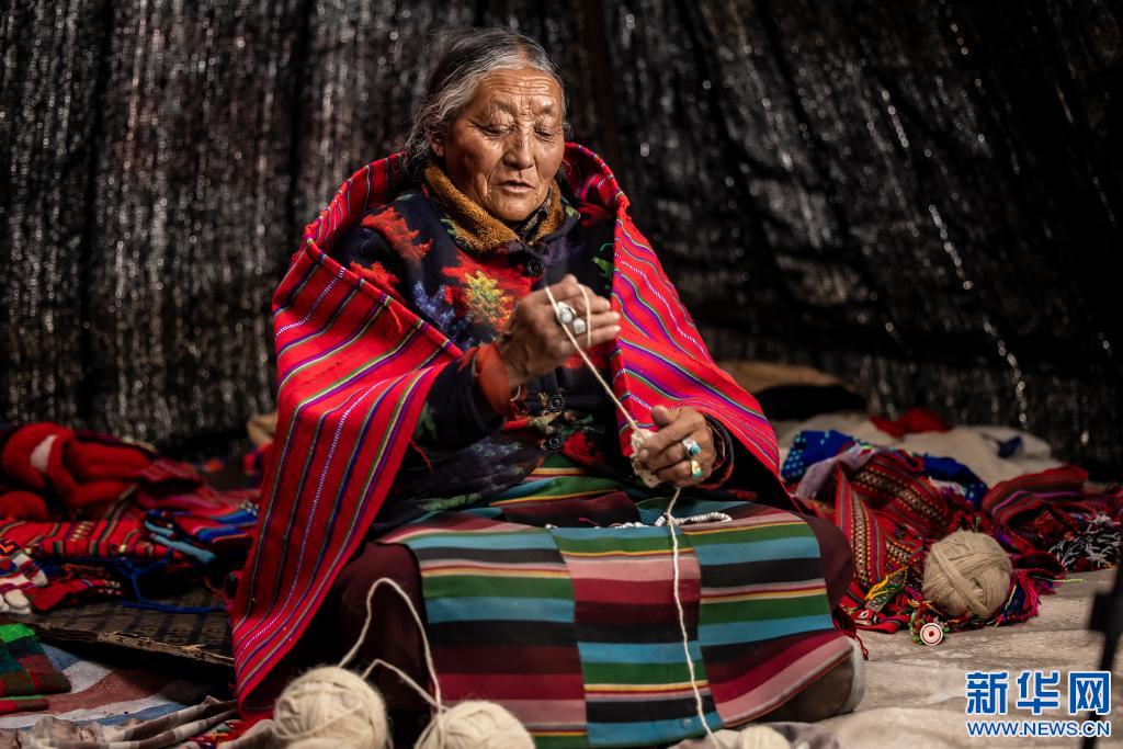 才旦拉姆老人在家里編織氆氌(4月27日攝)。新華社 貢覺群培 攝