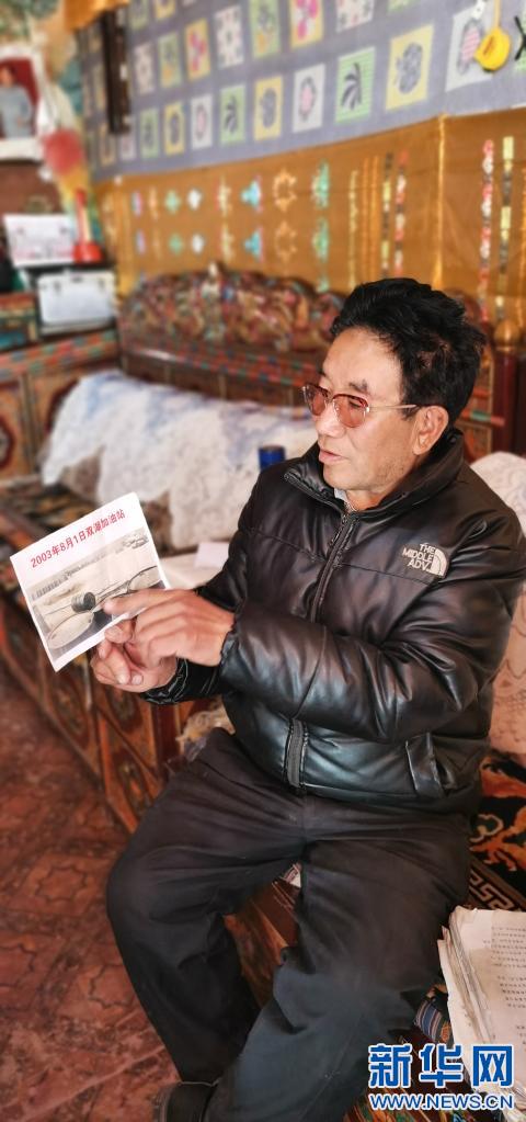 占堆拿著老照片講述以前加油站的事(2021年4月11日攝)。新華社記者 張京品 攝