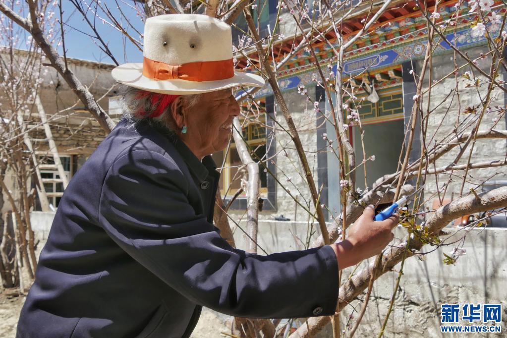 頓珠旺杰在修剪家里的桃樹(shù)樹(shù)枝(4月5日攝)。新華社記者 孫陽(yáng) 攝