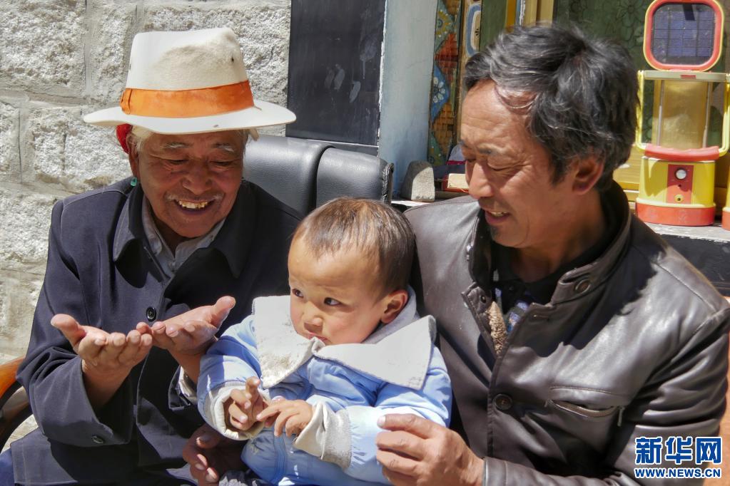 頓珠旺杰(左)和重孫玩耍(4月5日攝)。新華社記者 孫陽(yáng) 攝