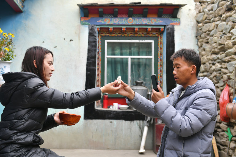 扎西拉姆(左)把剛?cè)嗪玫聂佤芜f給拍攝短視頻的丈夫田輝(4月2日攝)。新華社記者 孫瑞博 攝