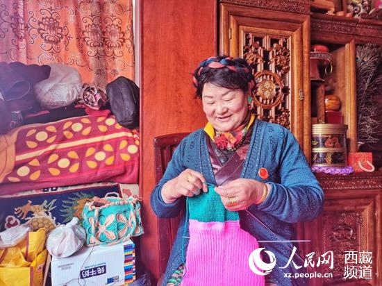 央金正在織毛衣,陽(yáng)光灑在她的臉上。人民網(wǎng) 李海霞攝