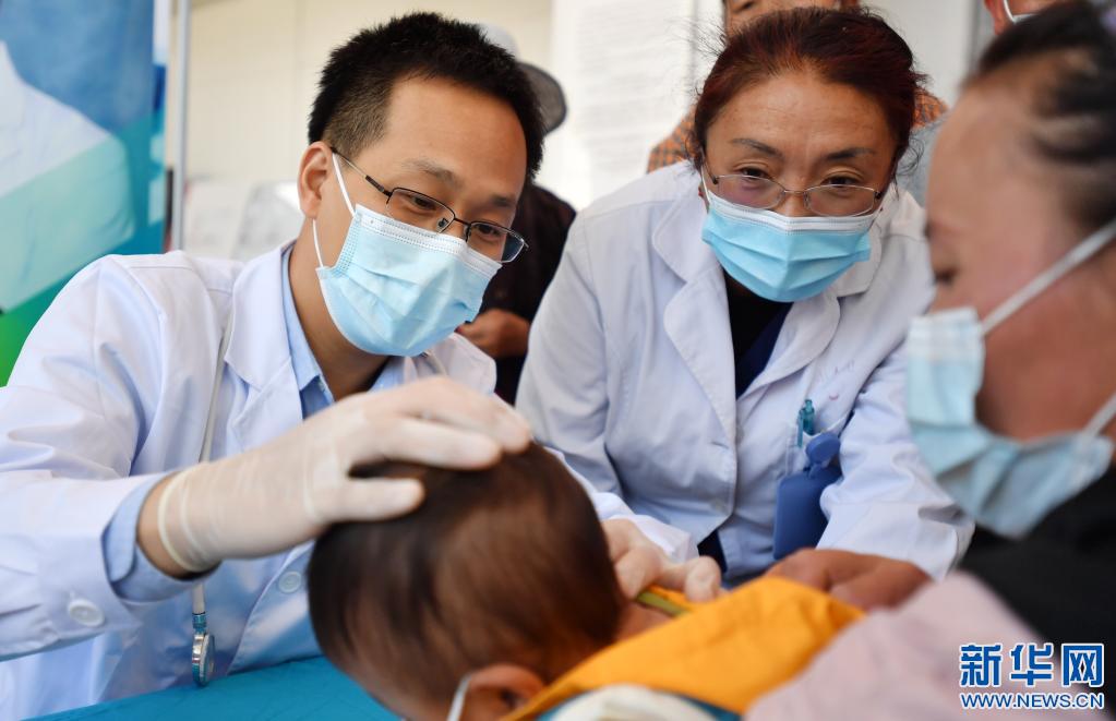6月1日,在拉薩市人民醫(yī)院,首都兒科研究所附屬兒童醫(yī)院醫(yī)生張建昭(左)為一名藏族孩子做檢查。新華社記者 覺(jué)果 攝