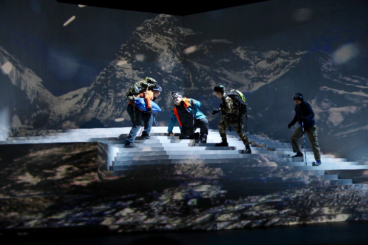 舞臺(tái)上,話劇《種子天堂》劇情進(jìn)入最高潮——在缺氧、強(qiáng)風(fēng)惡劣環(huán)境下,鐘揚(yáng)拼盡氣力來到海拔6000米的高度。當(dāng)他終于在一堆雜草和冰雪中發(fā)現(xiàn)那株頑強(qiáng)的雪蓮時(shí),就像父親看到自己剛出生的嬰兒,臉上掛著深深的喜悅,凝望良久……