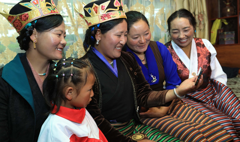 西藏自治區(qū)拉薩市墨竹工卡縣群眾通過手機(jī)收看慶祝大會。記者 洛桑 次旺 唐斌 潘多 攝