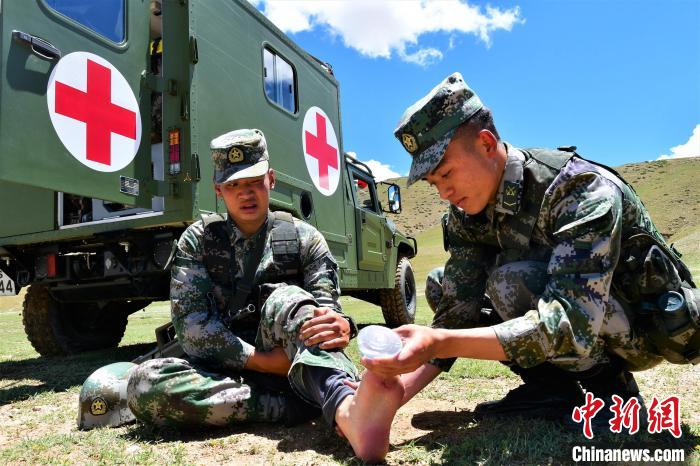 圖為西藏軍區(qū)某合成旅野外拉練途中處理官兵腳傷。萬(wàn)玲 攝
